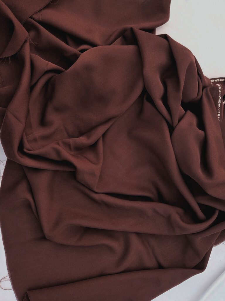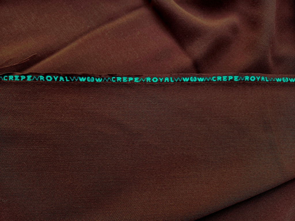 100% wollen crêpestof in een warme bruine kleur, soepel en elegant. De stof rimpelt niet en heeft een zeer goede vintage kwaliteit, ideaal voor zowel klassieke als feestelijke kledingstukken.