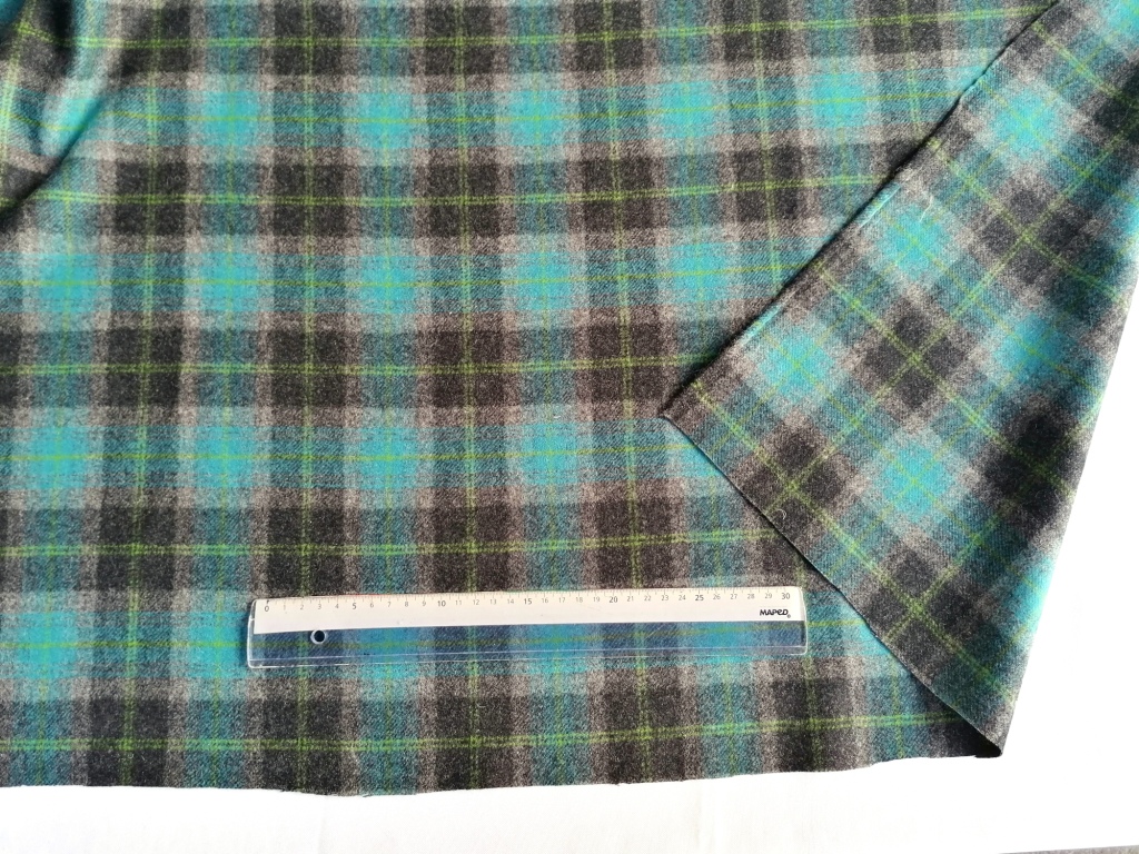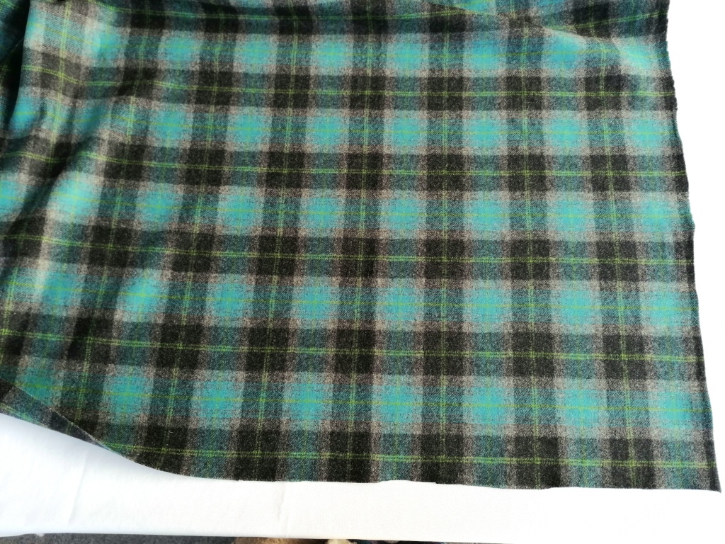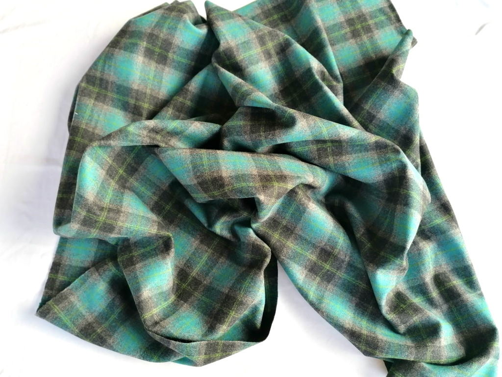 blauwgroen, zwart grijze geruite wollen stof van de Engelse fabrikant Moon.