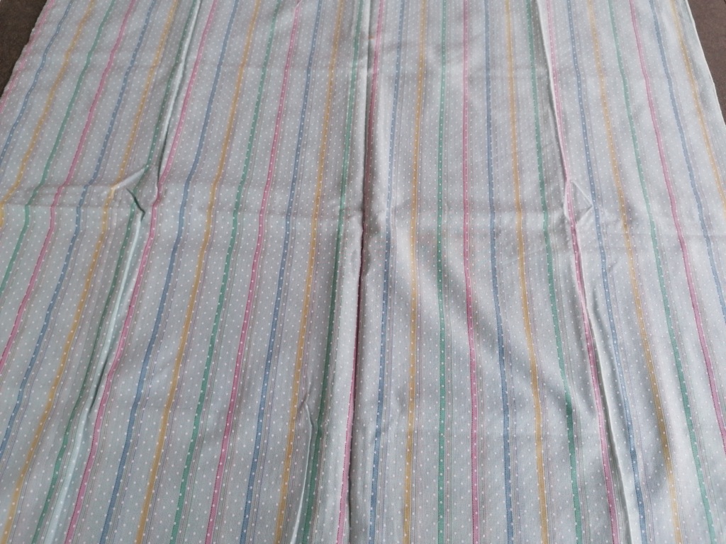 zachte strepen in geel blauw en roze en daarbij nog witte bolletjes in relief