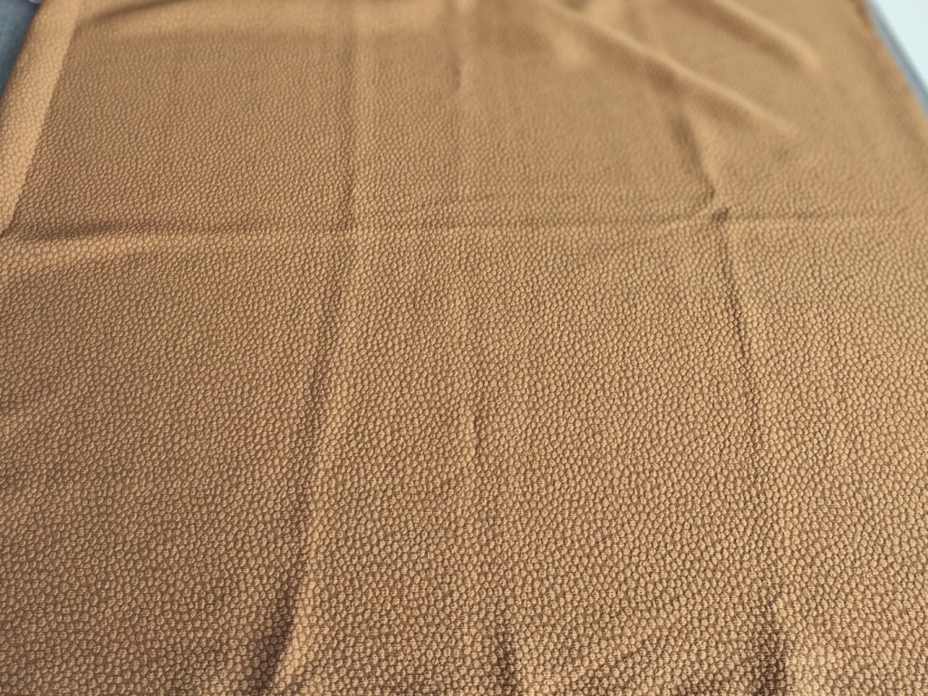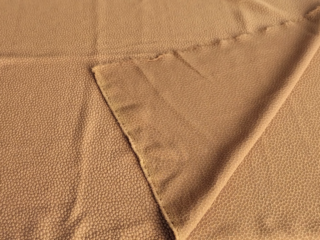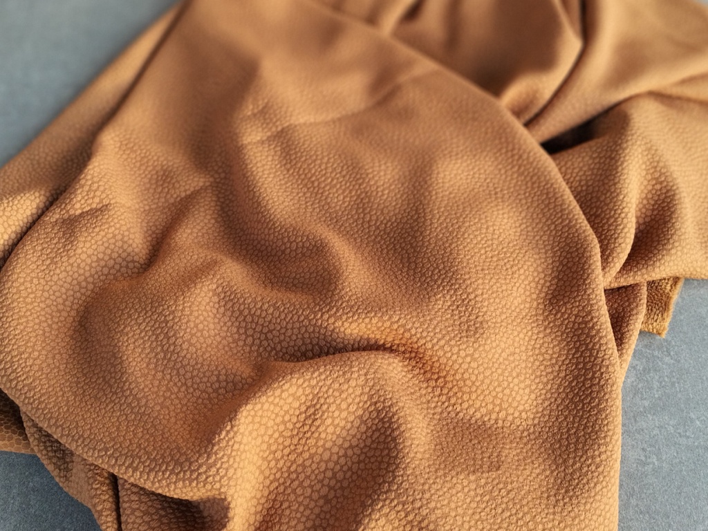 Deze lichtchocolade bruine stof met nopjes in reliëf heeft een subtiele textuur en een klein beetje rek, wat extra draagcomfort geeft. Het gaat om een echte oude stof van zeer goede kwaliteit. Ideaal voor een blouse, kleed of rok met een zachte, elegante uitstraling.