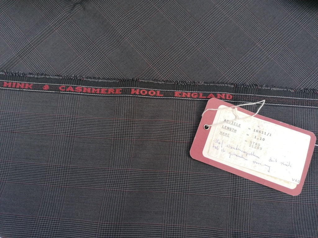 Deze cashmere wollen Prince-de-Galles stof is een vintage kwaliteitsstof van het gerenommeerde textielbedrijf Scabal, wereldwijd gekend om zijn hoogwaardige herenpakken. De stof is dun, soepel en verfijnd, met een kleur-op-kleur Prince-de-Galles motief. Beide zijden zijn identiek afgewerkt, wat de luxe kwaliteit benadrukt