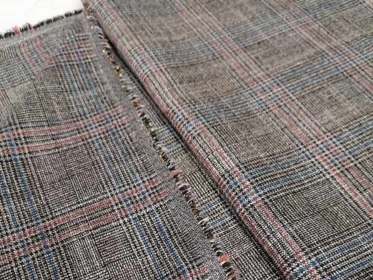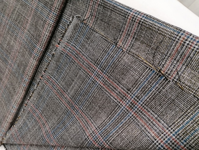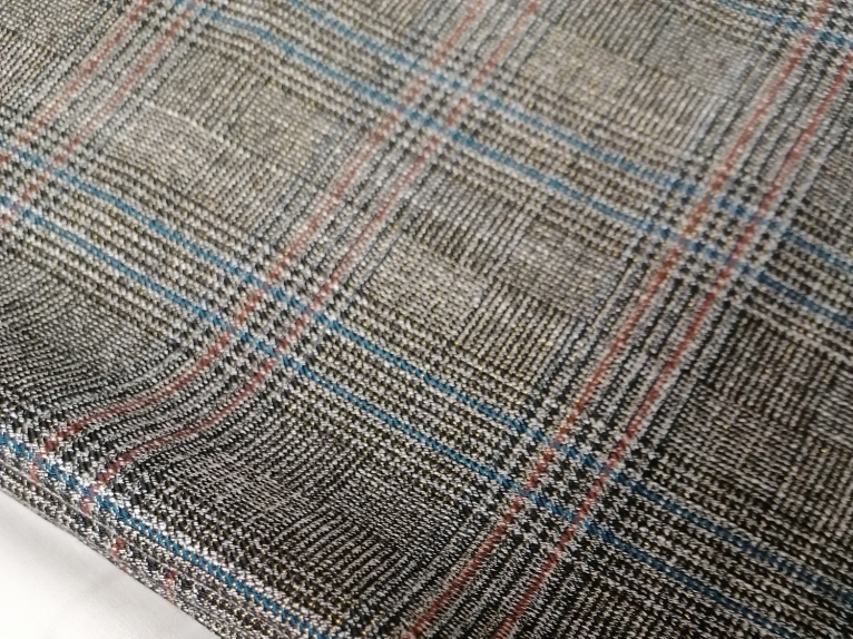 polyester stof grijs zwart geruit met een schijn van gouddraad beide zijden identiek.