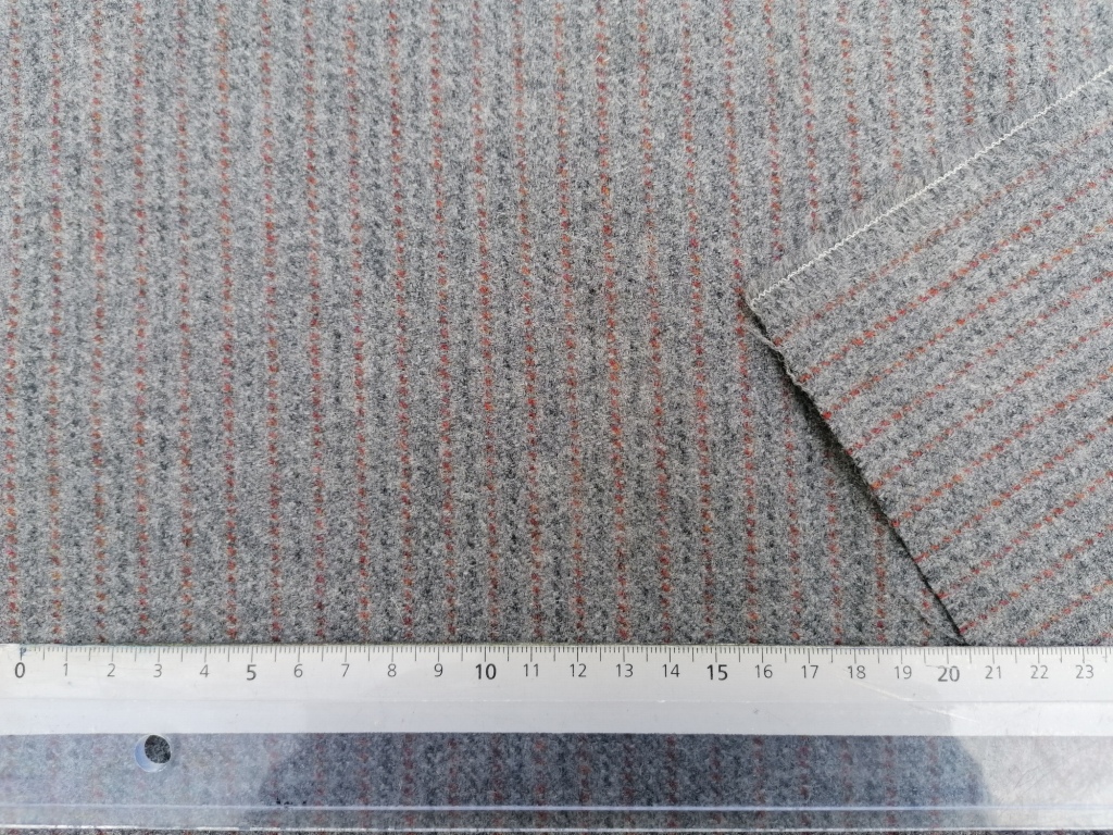 Deze grijze wollen krijtstreep stof is een vintage stof van zeer goede kwaliteit, uitgevoerd in 100% wol. Het fijne rood- en donkergrijze krijtstreepdessin geeft de stof een klassieke, tijdloze uitstraling. De kwaliteit is dunne walkloden: soepel, compact en met een mooie, verzorgde structuur.