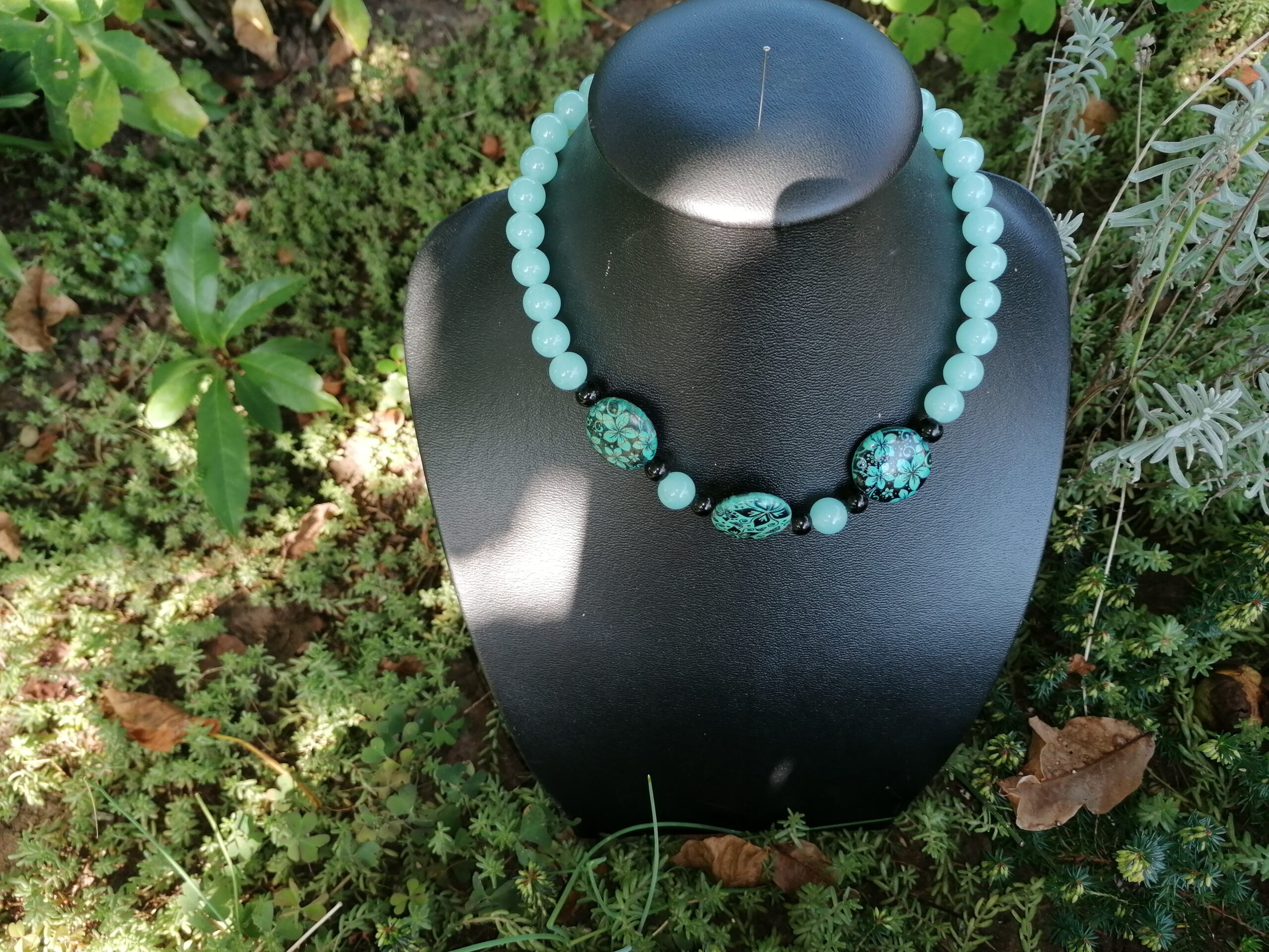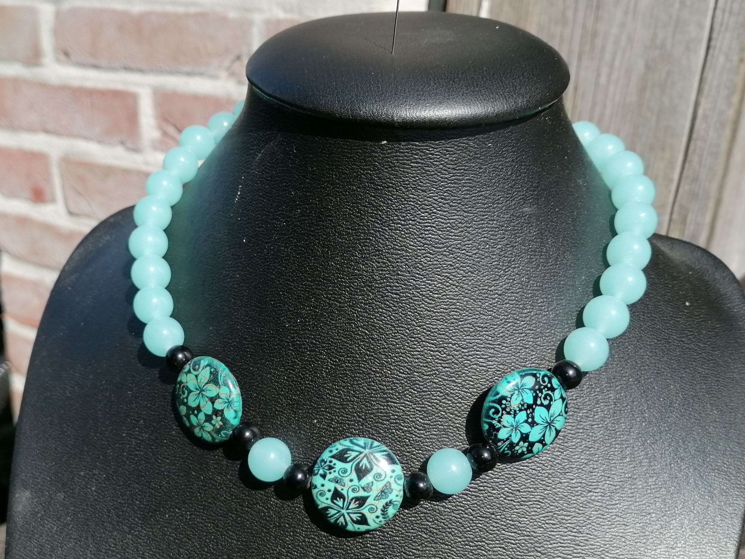 halsketting met mintgroene kunststof kralen met platte fantasie kralen tussen zwarte kralen (46cm)