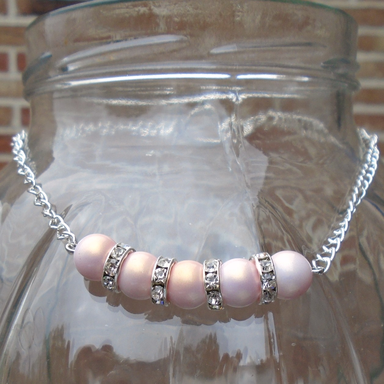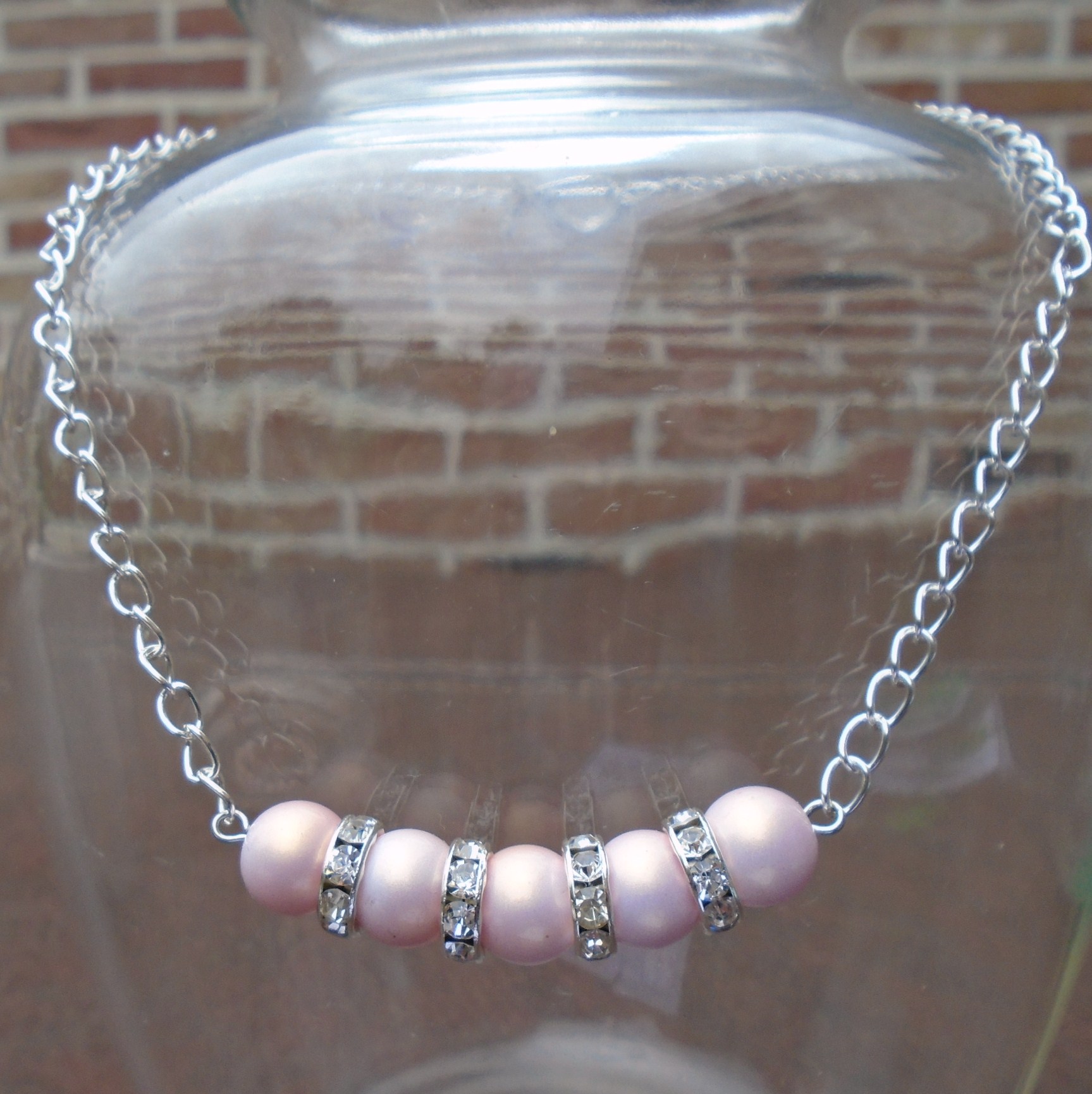 halsketting met zacht roze kunststof kralen (10mm) en zilverkleurige rondellen met strass kraaltjes