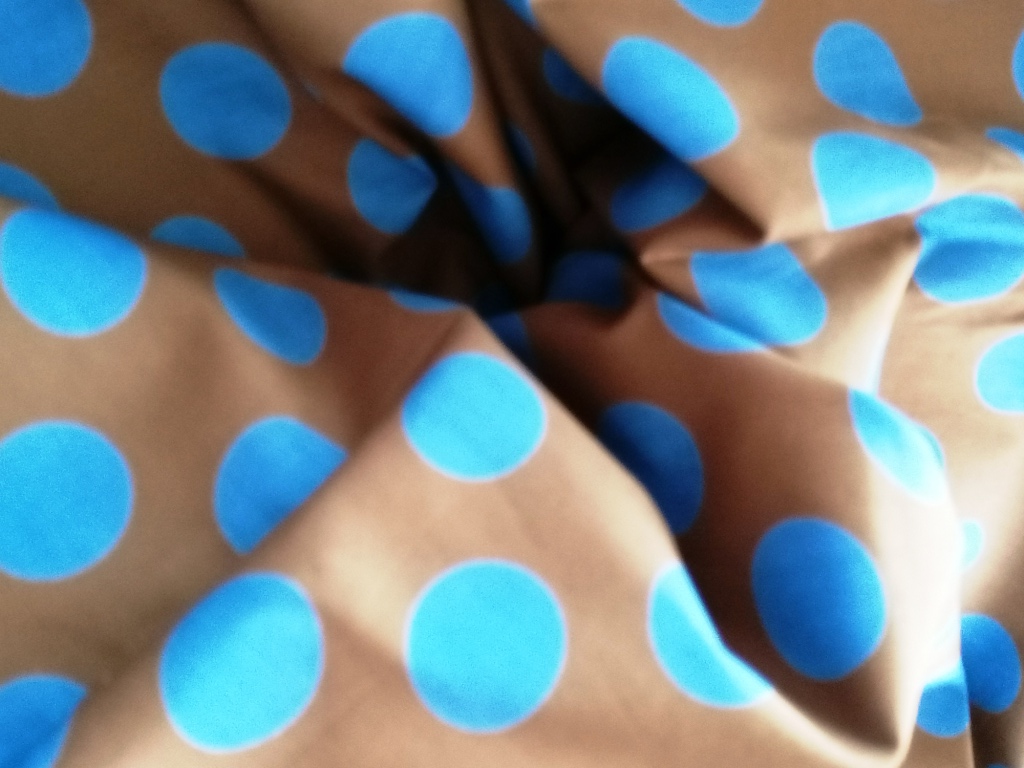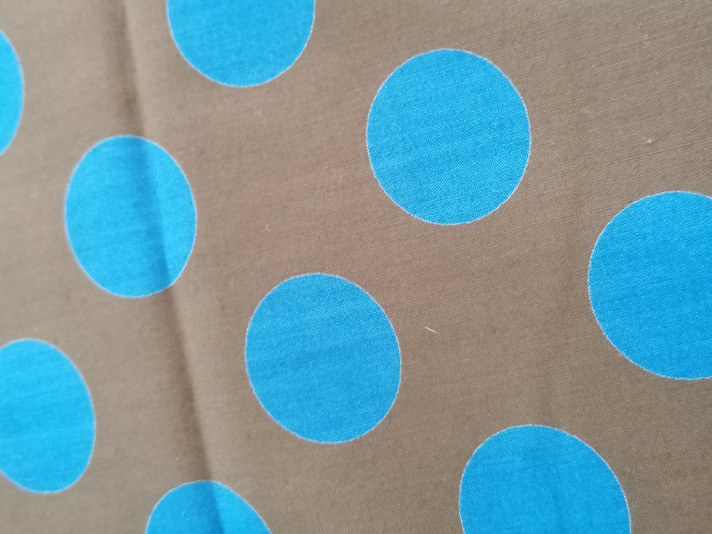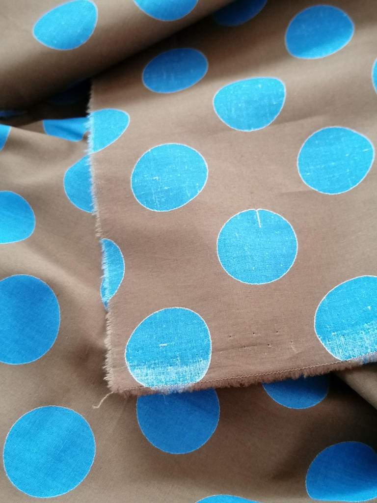 zeer fijne katoen, vintage kakibruin met blauwe bollen van 2,7cm