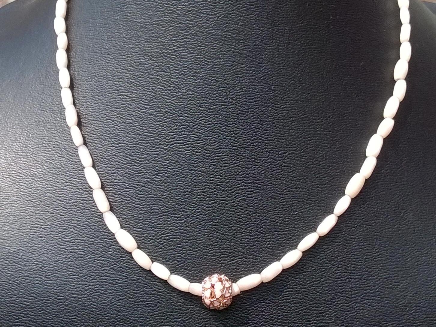 kralenketting van beige kleine langwerpige cateye kralen met een roosachtige metalen fantasie kraal (52cm)