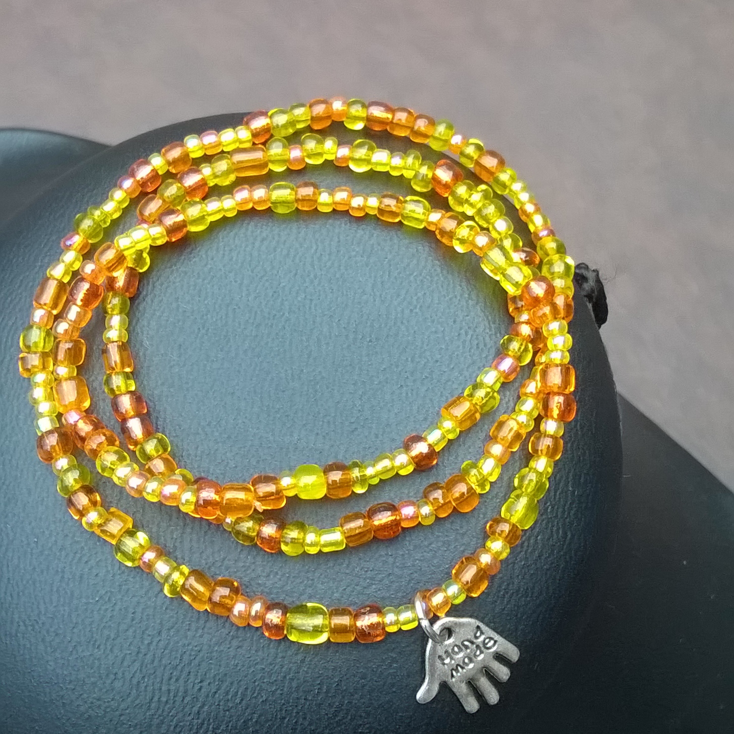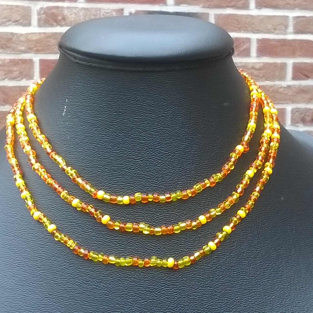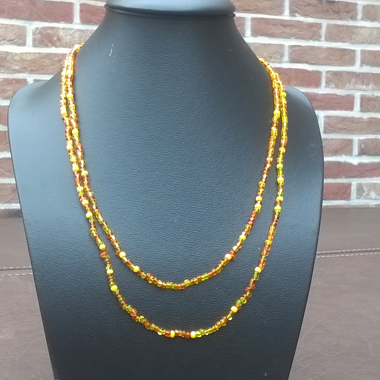 zeer lange ketting met geel orange kraaltjes op elastiek