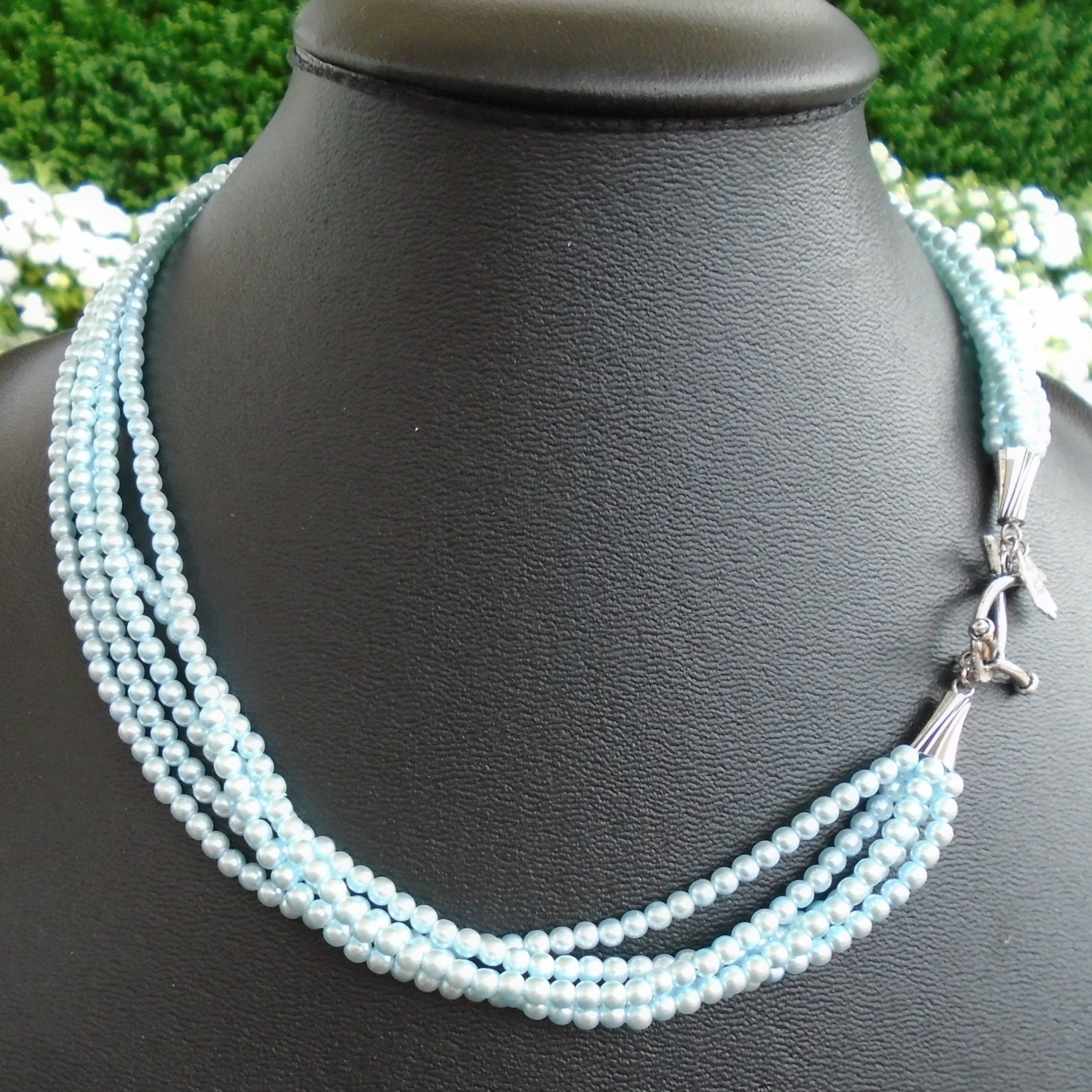 kralenketting van kleine lichtblauwe pareltjes (5-delig) kan ook geknoopt gedragen worden (54cm).