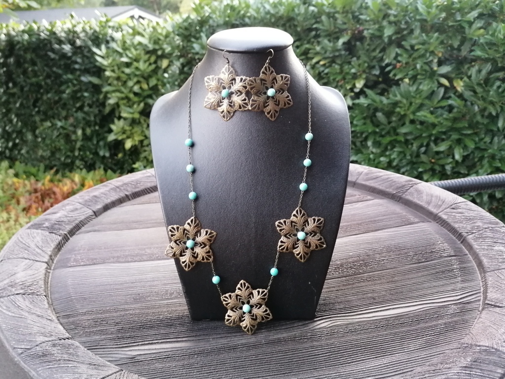 setje van koperen bloemen met blauwe kralen op koperen ketting