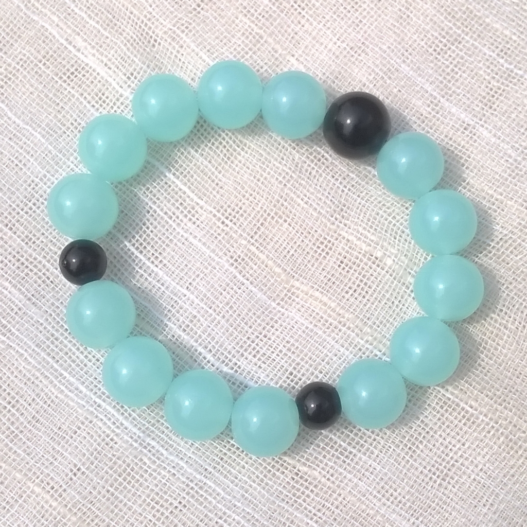 setje van mintgroene kunststof kralen met platte fantasie kralen tussen zwarte kralen (46cm)