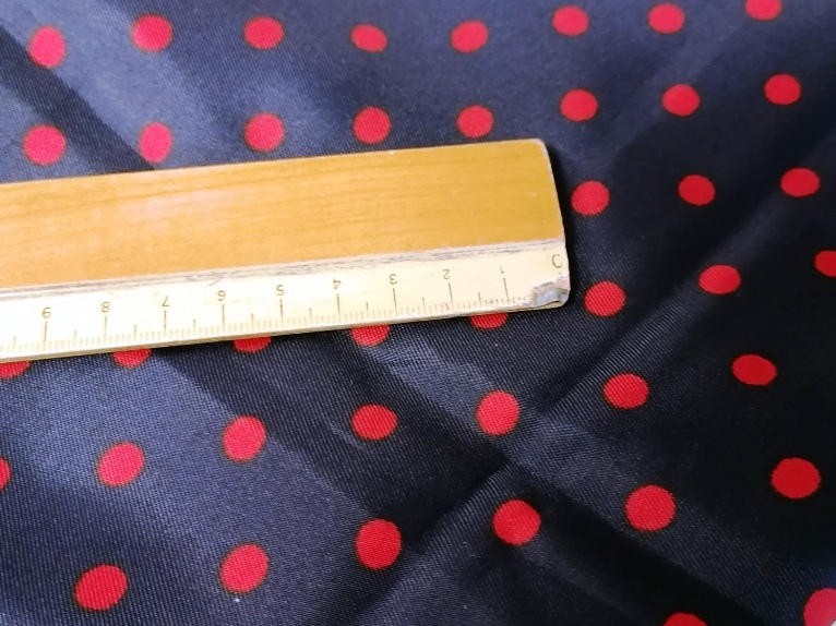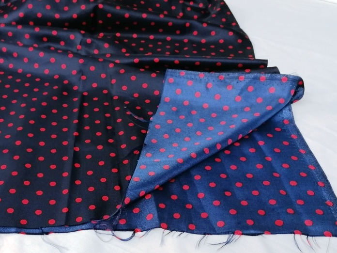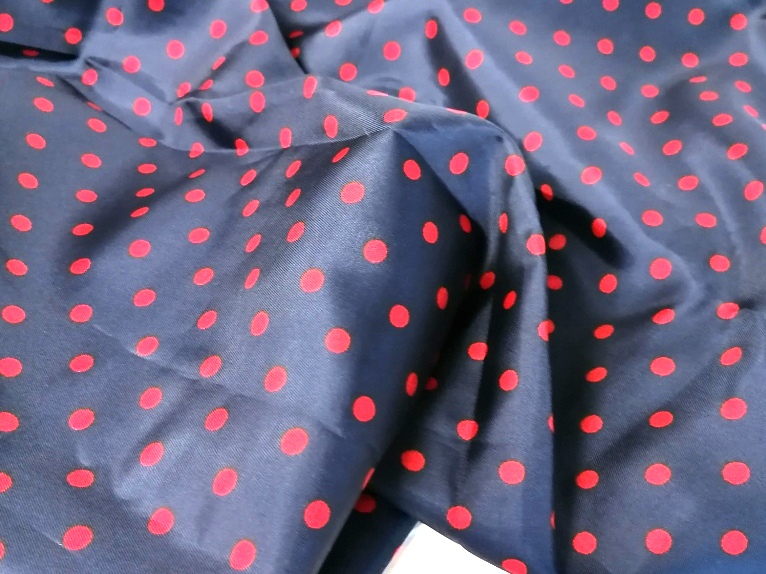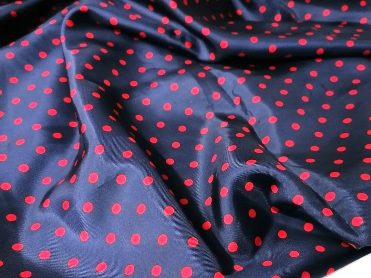 synthetische zijdeachtige satijn blauw met rode bollen van 0,7 cm