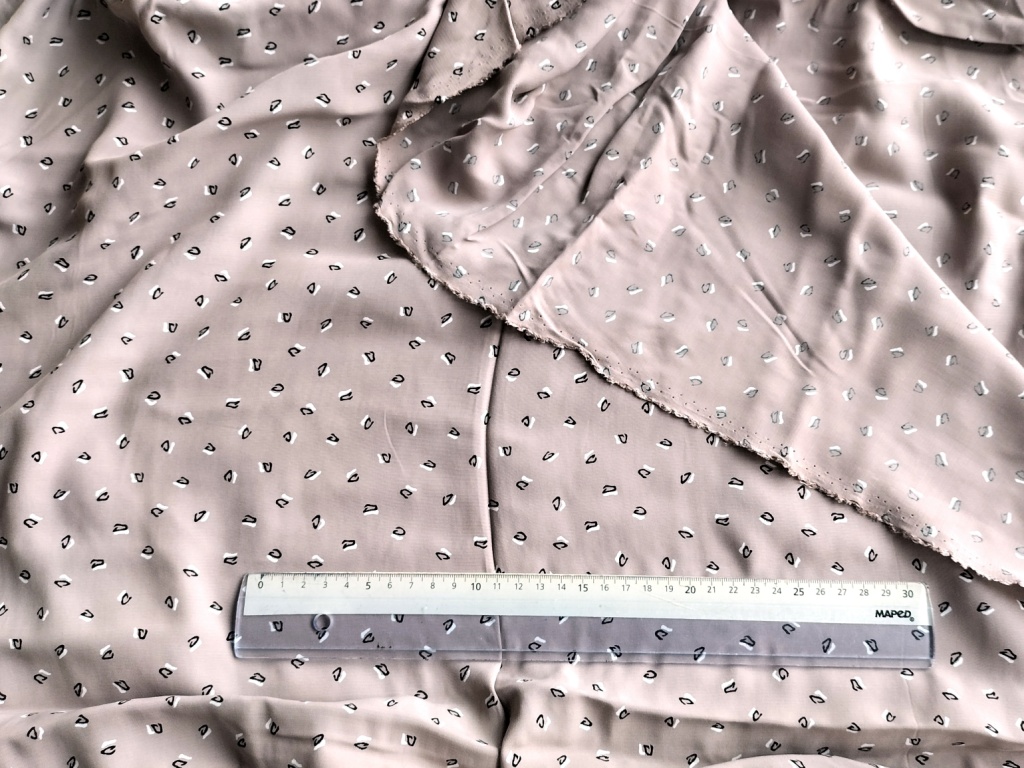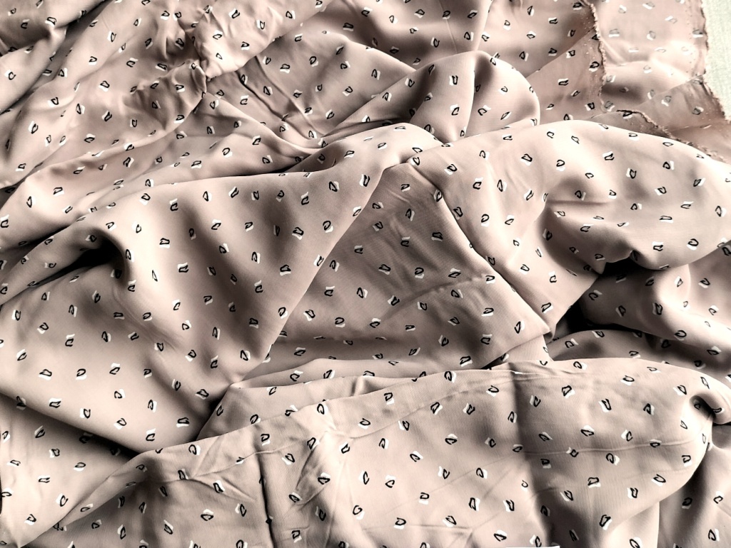 Dunne matte stof in een warme taupe kleur met kleine witte en zwarte vlekjes. De stof heeft een zachte uitstraling en bevat viscose, waardoor ze soepel valt.