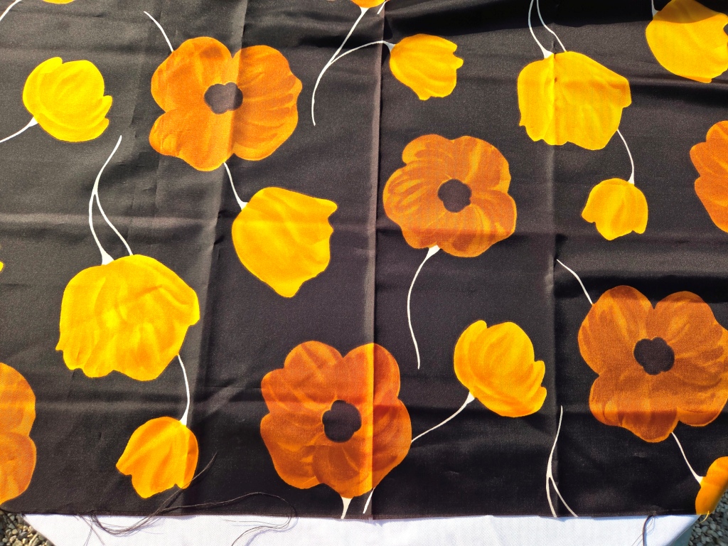 Vintage gladde stof met een zwarte ondergrond en grote okerkleurige bloemen die zorgen voor een krachtige en elegante uitstraling. De stof voelt eerder stevig aan en is niet heel soepel, waardoor ze bijzonder geschikt is voor kledingstukken die mooi hun vorm behouden. Ideaal voor een blouse, feestkledij, kleed of rok met karakter.