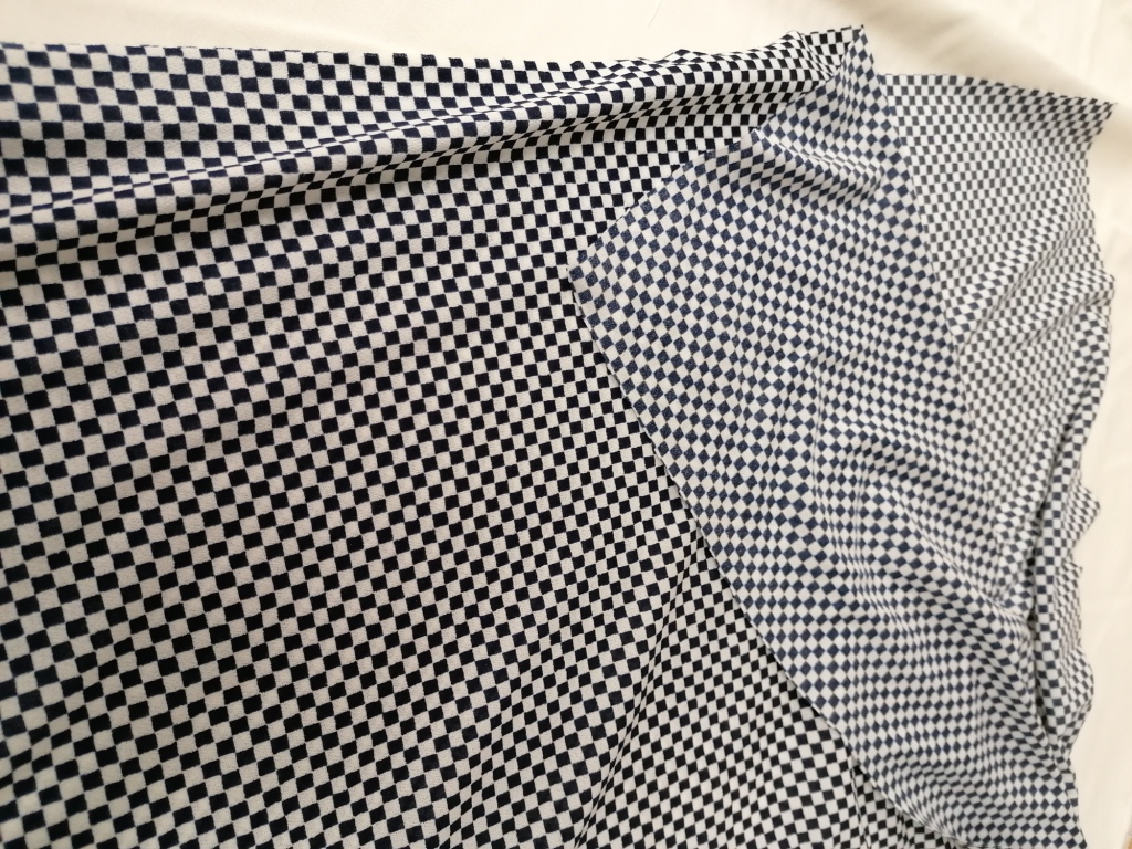 Dunne rekbare jersey met witte en donker blauwe blokjes