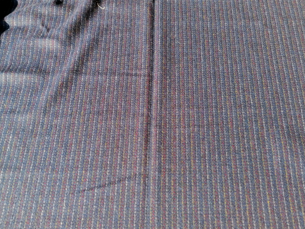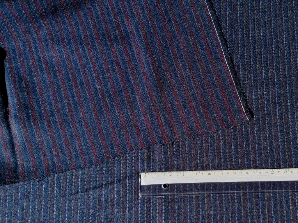 Deze wollen stof met blauwe en rode strepen heeft een fijn krijtlijntje ertussen. De andere zijde toont het rood minder, terwijl de witte lijn beter zichtbaar is. Beide zijden zijn bruikbaar. Ideaal voor blazer, rok, vest of kleed. Het gaat om een echte oude stof van zeer goede kwaliteit.