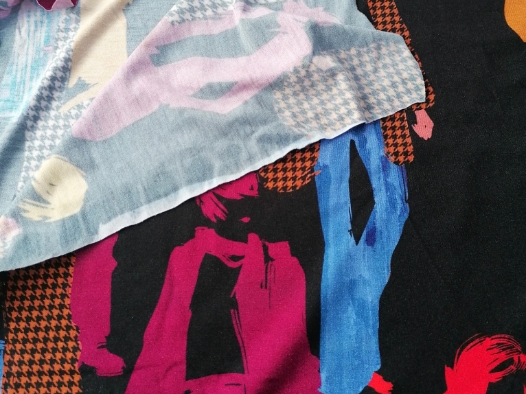 dunne (viscose) jersey met fel gekleurde nogal grote personen op